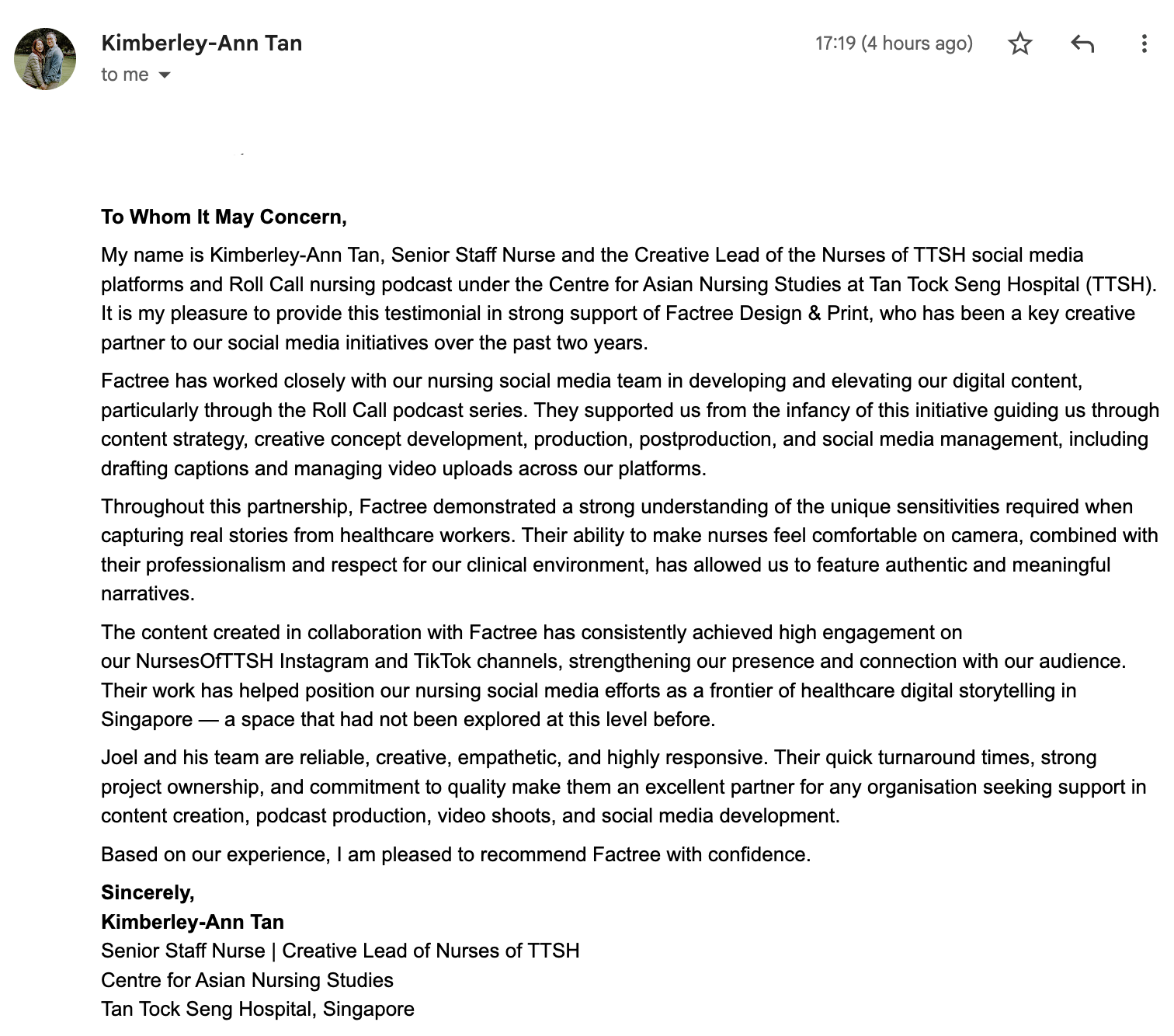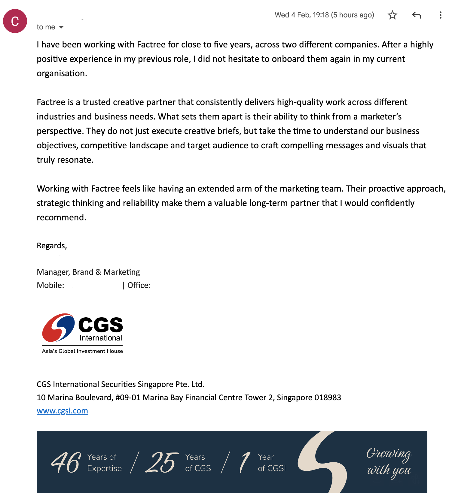 The team at Factree understands what is required right from the start. They seem to approach creative work differently, providing new perspectives that is always centered around our customers and not just our product, making our campaign more relatable. I’ve since recommended them to the rest of my departments and my boss likes them because they are cost effective as well.- DA, Professional services